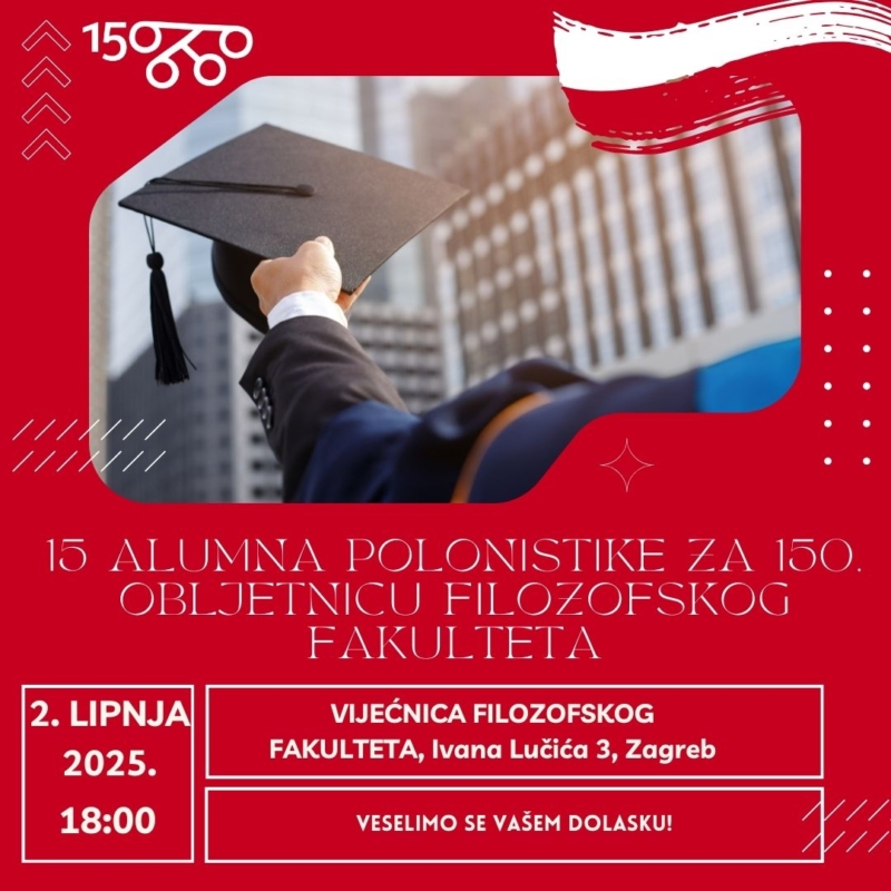 Članovi Katedre za poljski jezik i književnost Odsjeka za zapadnoslavenske jezike i književnosti srdačno vas pozivaju na okrugli stol pod nazivom 15 alumna polonistike za 150. obljetnicu Filozofskog fakulteta koji će se održati 2. lipnja u 18 sati u Vijećnici Filozofskog fakulteta.