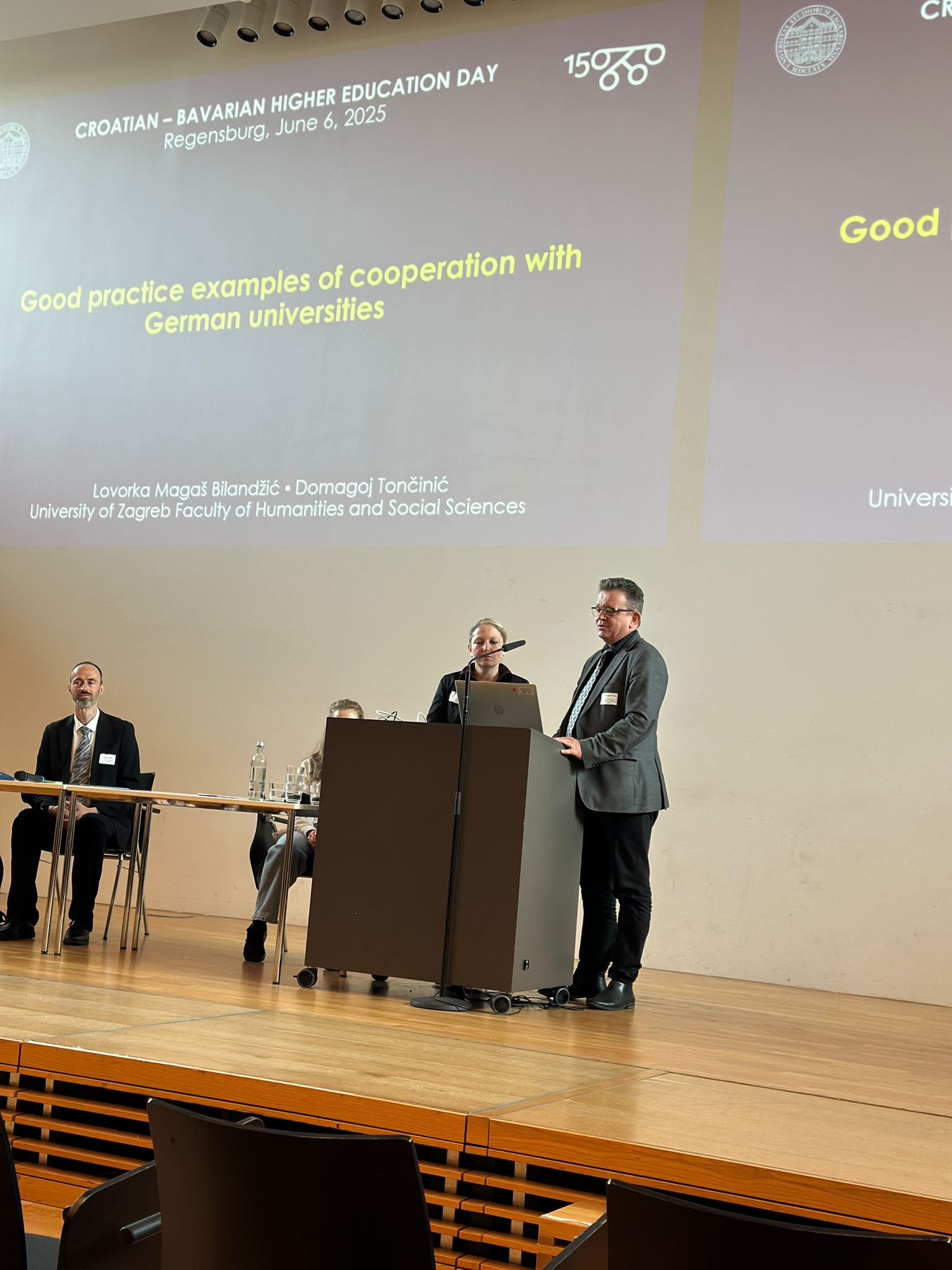 Dekan izv. prof. dr. sc. Domagoj Tončinić i prodekanica za znanost i međunarodnu suradnju izv. prof. dr. sc. Lovorka Magaš Bilandžić sudjelovali su na Croatian – Bavarian Higher Education Day (Danu hrvatsko-bavarskoga visokog obrazovanja) u Regensburgu 5. i 6. lipnja 2025. na kojemu su održali izlaganje „Good practice examples of cooperation with German universities“. U izlaganju je bilo riječi o Filozofskom fakultetu u cjelini, studijima, projektima te različitim modalitetima međunarodne suradnje s posebnim osvrtom na dosadašnju suradnju s njemačkim sveučilištima.
