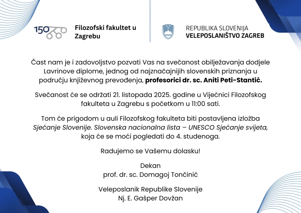 Odsjek za južnoslavenske jezike i književnosti s velikim vas zadovoljstvom poziva na svečanost obilježavanja dodjele Lavrinove diplome, jednog od najznačajnijih slovenskih priznanja u području književnog prevođenja, profesorici dr. sc. Aniti Peti-Stantić.