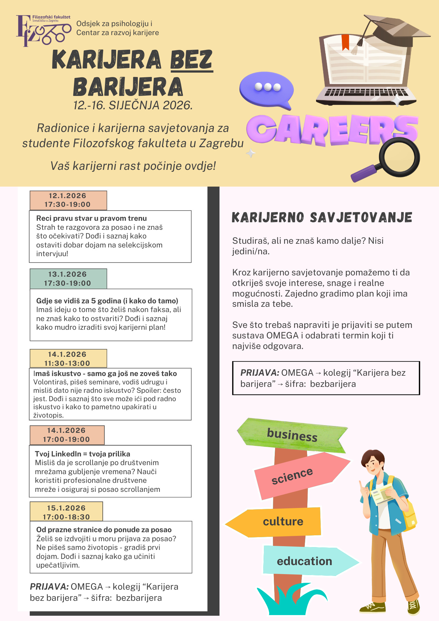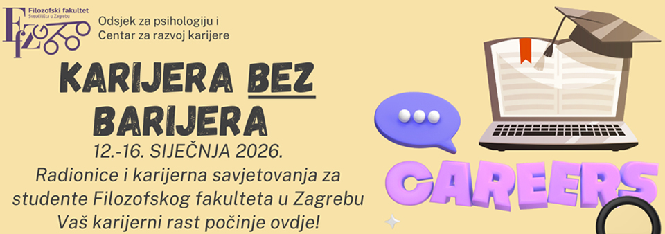 Centar za razvoj karijere u suradnji s Odsjekom za psihologiju organizira četvrti po redu tjedan karijera „Karijera bez barijera“ – ciklus radionica i individualnih karijernih savjetovanja namijenjenih studentima FFZG-a svih studijskih grupa i razina studija.