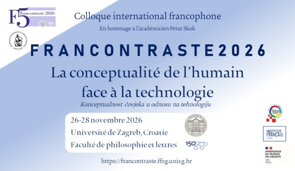 U organizaciji studijske grupe za Francuski jezik i književnost Odsjeka za romanistiku od 26. do 28. studenog 2026. na Filozofskome fakultetu u Zagrebu održat će se znanstveni skup Konceptualnost čovjeka u odnosu na tehnologiju: filološke perspektive.