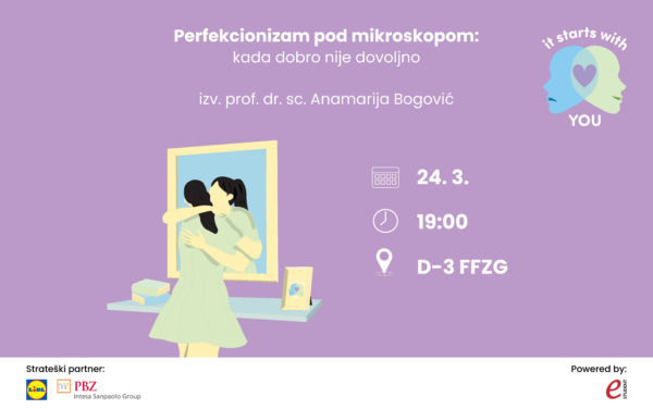 Stiže nam još jedno izdanje projekta It Starts With You u organizaciji eSTUDENT tima Evaluacije iz skupine Ljudski potencijali. It Starts With You poziv je svakom studentu da prepozna važnost brige o sebi te da učini prvi korak prema jačanju vlastitog mentalnog zdravlja. Kroz edukativne radionice i predavanja, kvalificirani profesori i stručnjaci predstavit će načine za prepoznavanje, reagiranje i prihvaćanje poteškoća mentalnog zdravlja kod sebe ili kod ljudi u svojoj okolini. Cilj je kroz ovu edukaciju potaknuti otvoreni razgovor o mentalnim poteškoćama, smanjiti stigmu koja ih često prati te ohrabriti sudionike da brigu o sebi prihvate kao sastavni dio svakodnevnog života. Studenti se ne trebaju osjećati sami u svojim problemima, a ovakav tip edukativnog sadržaja postepeno potiče otvorenost i podršku među studentskom zajednicom.