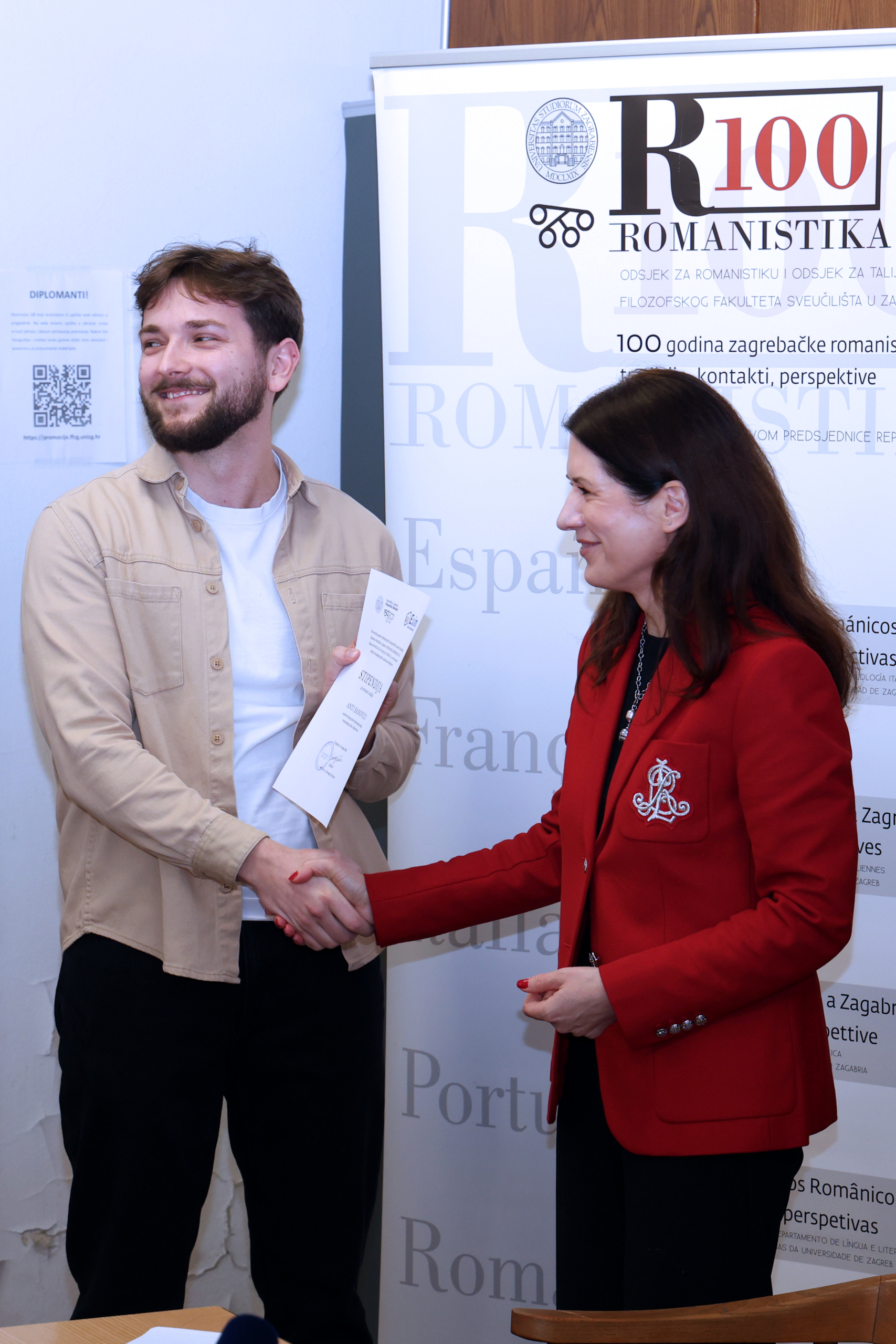 Potvrdu o stipendiji kolegi Banoviću uručila je veleposlanica Rumunjske, Nj. E. Mihaela Cămărășan. Na svečanosti su osim veleposlanice govorili i dekan Filozofskog fakulteta prof. dr. sc. Domagoj Tončinić te pročelnica Odsjeka za romanistiku prof. dr. sc. Ivana Franić. Oboje su u svojim govorima istaknuli važnost podrške manjinskim filologijama i ulogu studija rumunjskog jezika i književnosti kao jedinstvenog u Republici Hrvatskoj, što je prepoznala i Exim Banca Românească.
