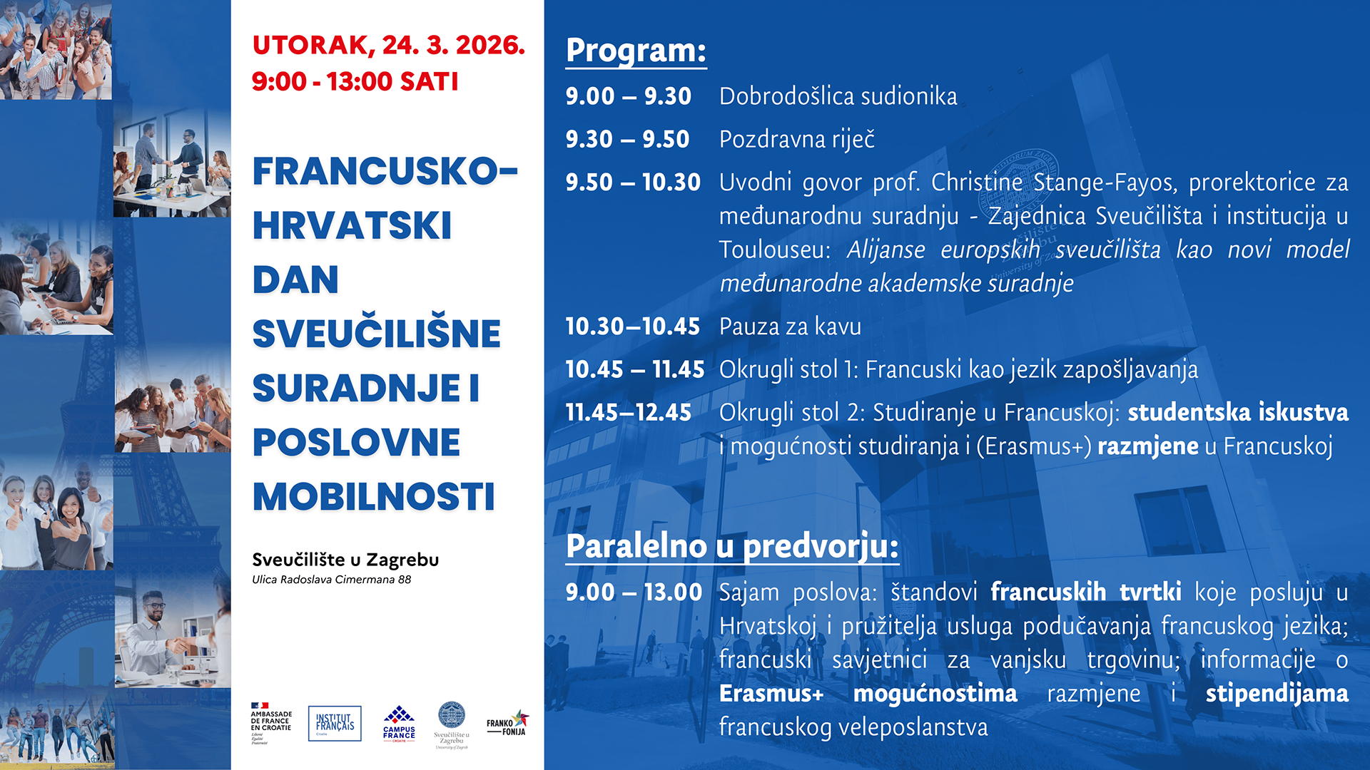 Pozivamo vas na Francusko-hrvatski dan sveučilišne suradnje i poslovne mobilnosti koji Sveučilište u Zagrebu, u suradnji s Veleposlanstvom Francuske Republike u Republici Hrvatskoj, organizira u utorak, 24. ožujka 2026. od 9 do 13 sati na Rektoratu Sveučilišta u Zagrebu, Ulica Radoslava Cimermana 88.